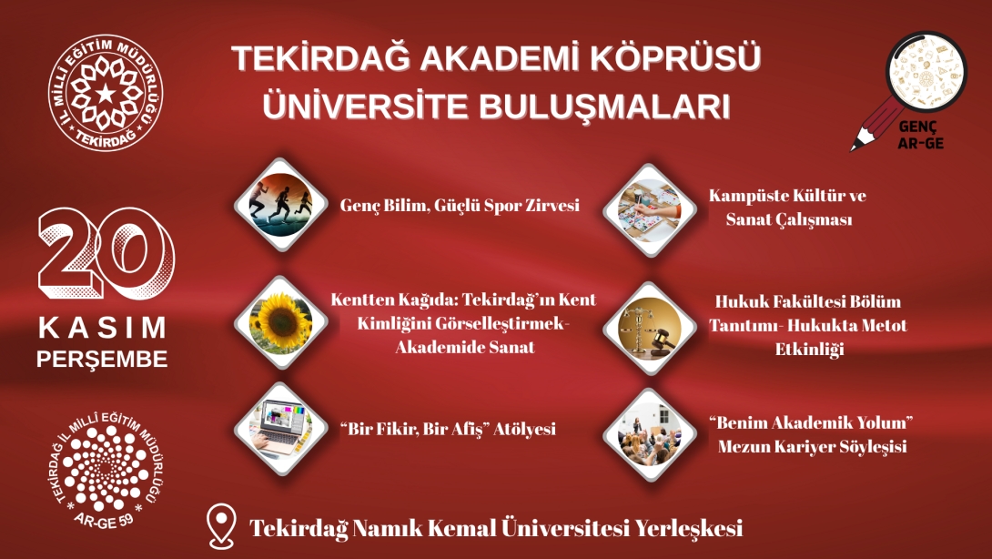 Tekirdağ İl Millî Eğitim Müdürlüğü AR-GE Birimi tarafından yürütülen Tekirdağ Akademi Köprüsü Projesi kapsamında lise öğrencilerinin akademik ve bilimsel gelişimlerini desteklemek amacıyla "Üniversite Buluşmaları" etkinliği düzenlemiştir.